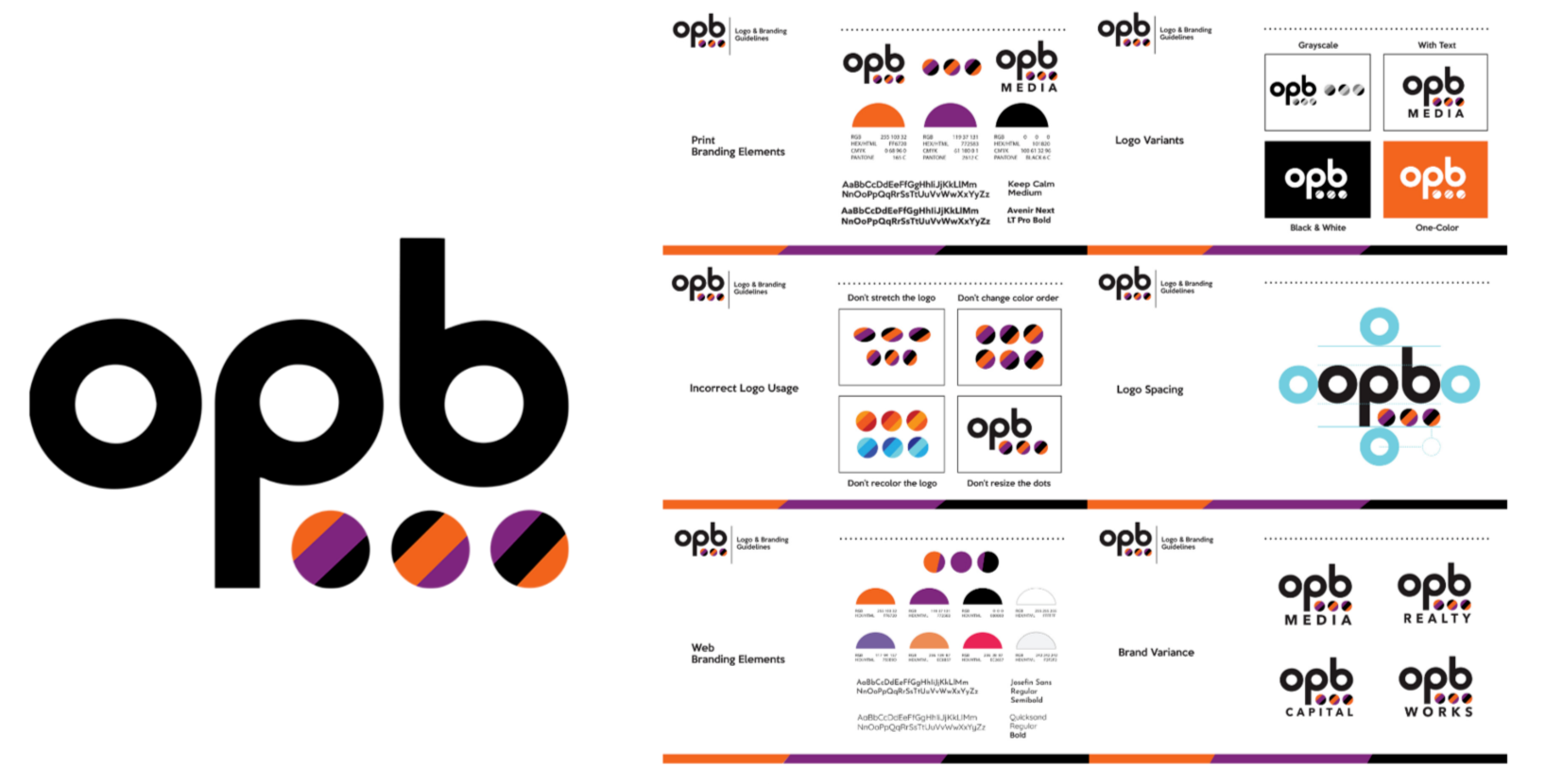 OPB, which stands for "Other People's Business", is a multipurpose agency covering marketing, realty, investments and co-working spaces. The original logo had each dot taking on one of the brand's three colors; I redesigned it to represent how interlinked all aspects of the agency are in their operations.After the logo was reworked, I created a new brand identity handbook that encompasses how to use the logo in print and on the web.